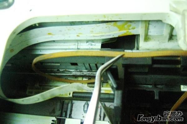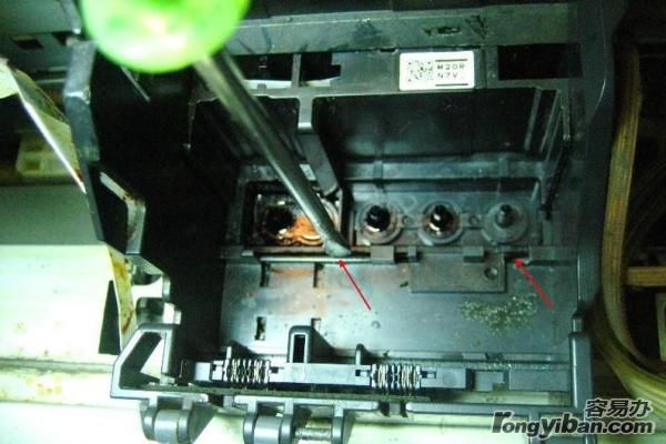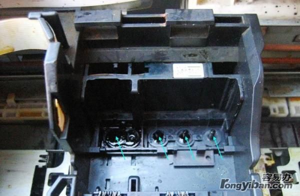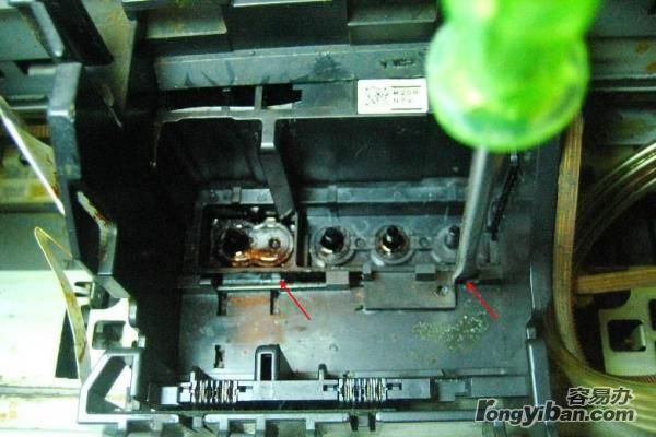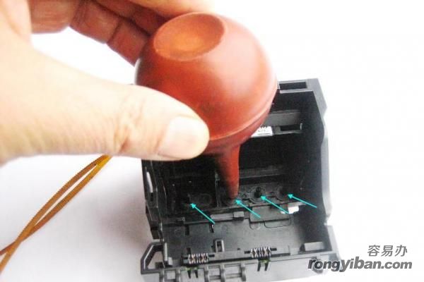 将装有热水的洗耳球从墨头内部顶洗喷头(压力适当,不能太大,避免压力太大造成喷头内部精密结构损坏),分别顶洗喷头的四色墨管: