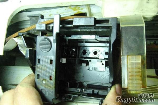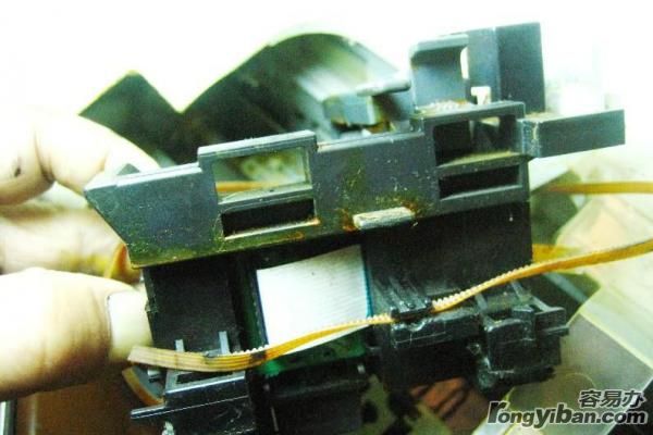 从红色箭头两个位置拨开墨头架,才能从导轨上取下字车: